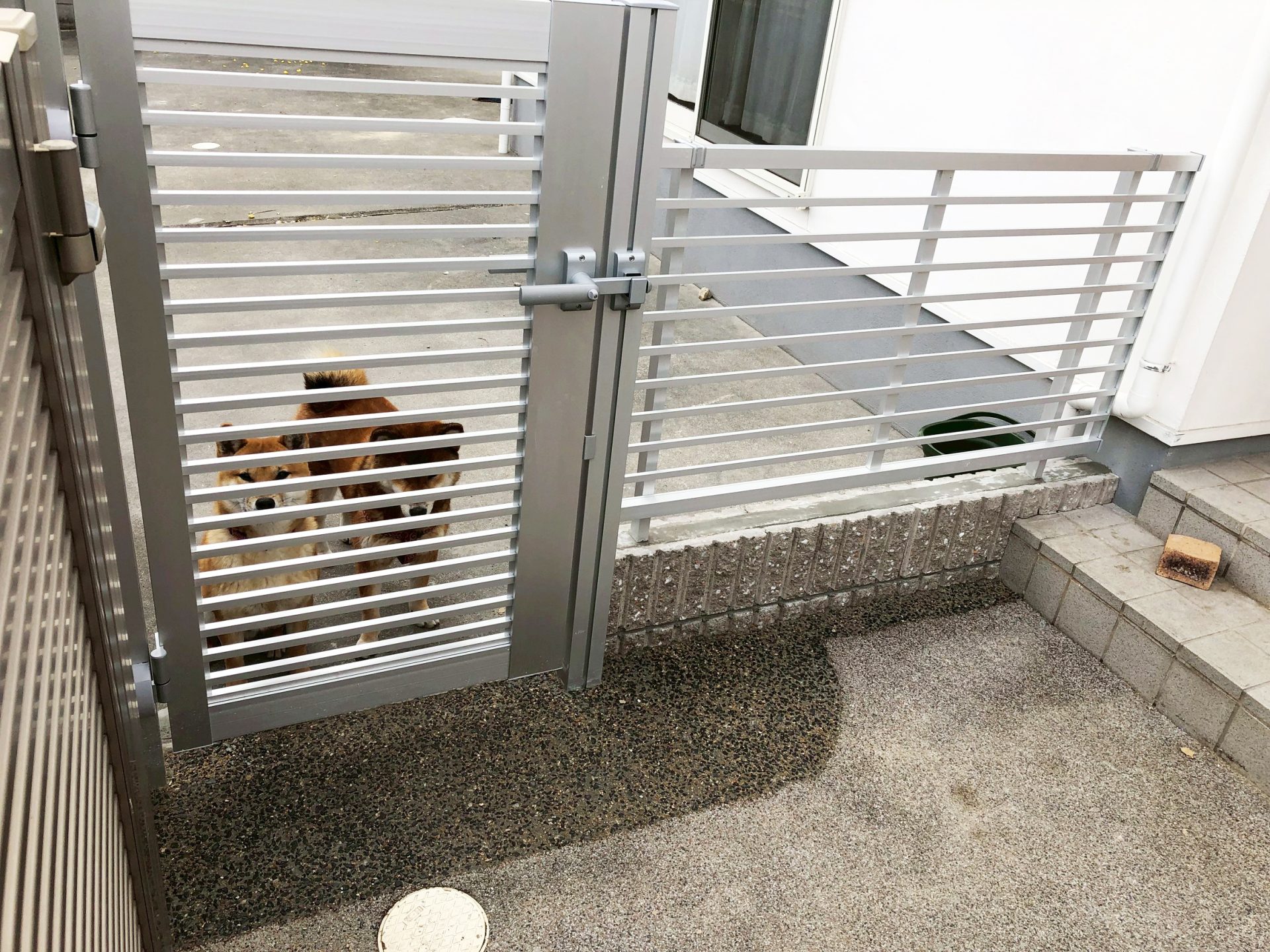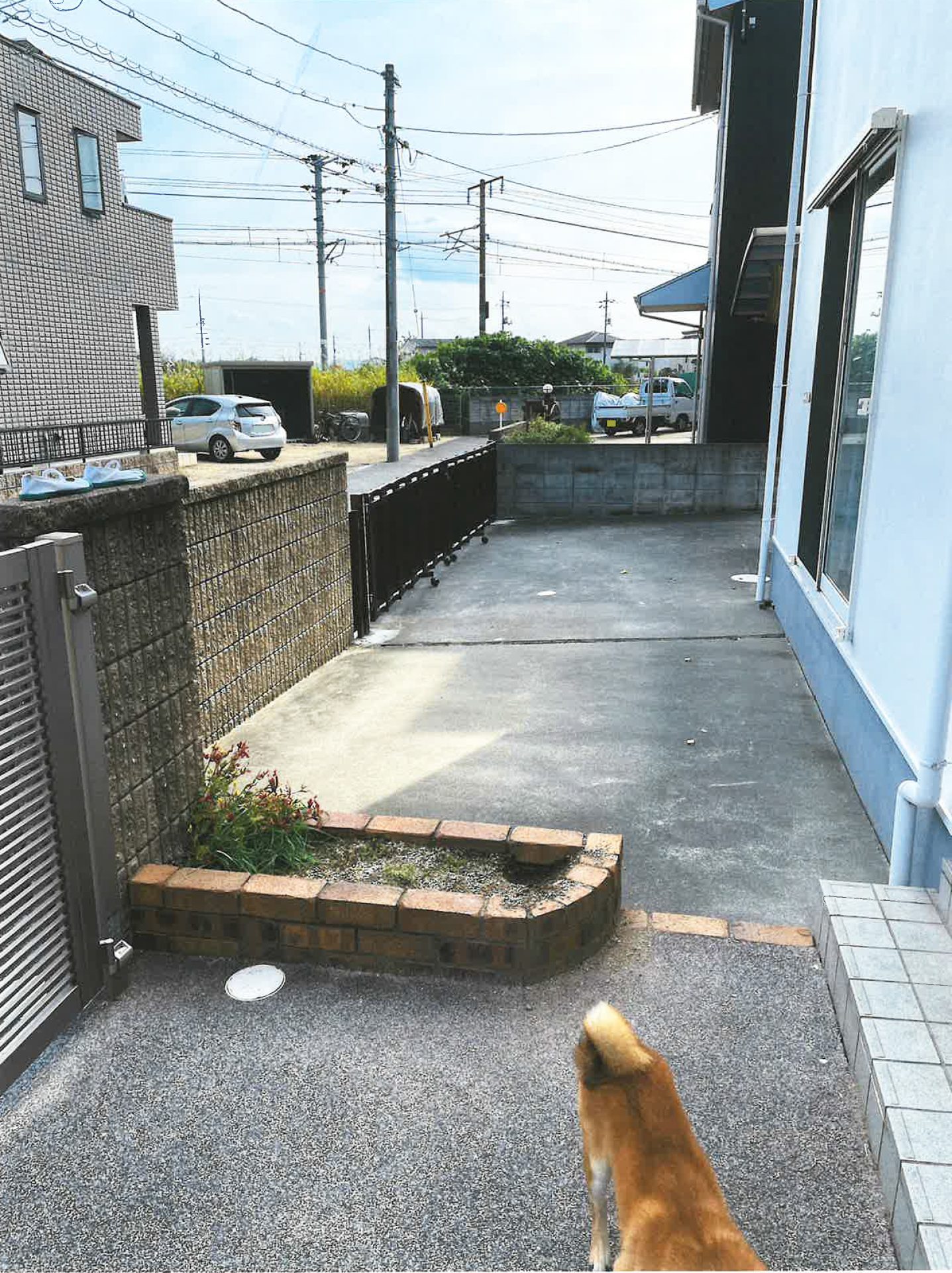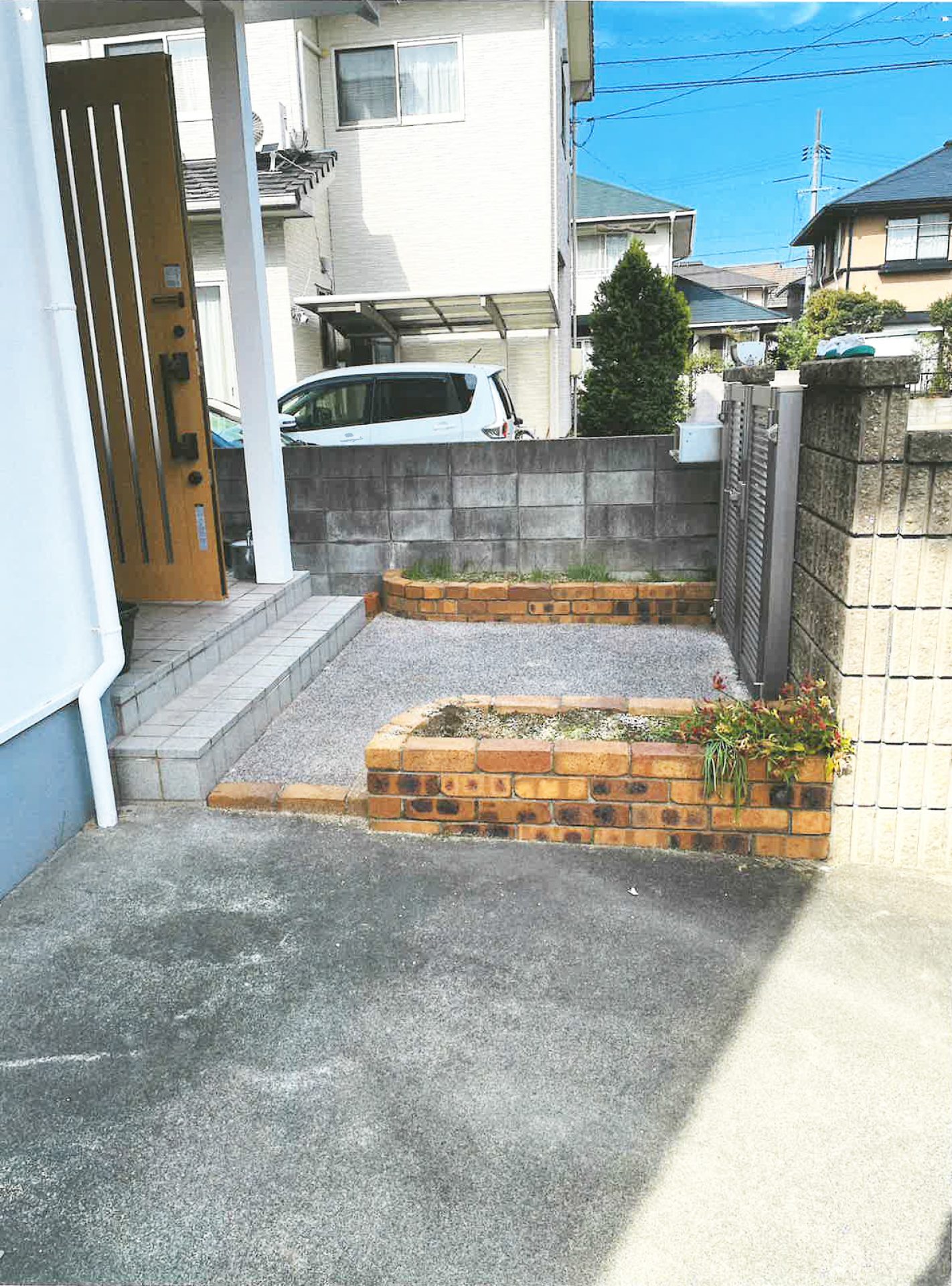 玄関前の花壇を撤去し、フェンスと門扉を設置して愛犬が安全に遊べるように囲われた空間を作りました。