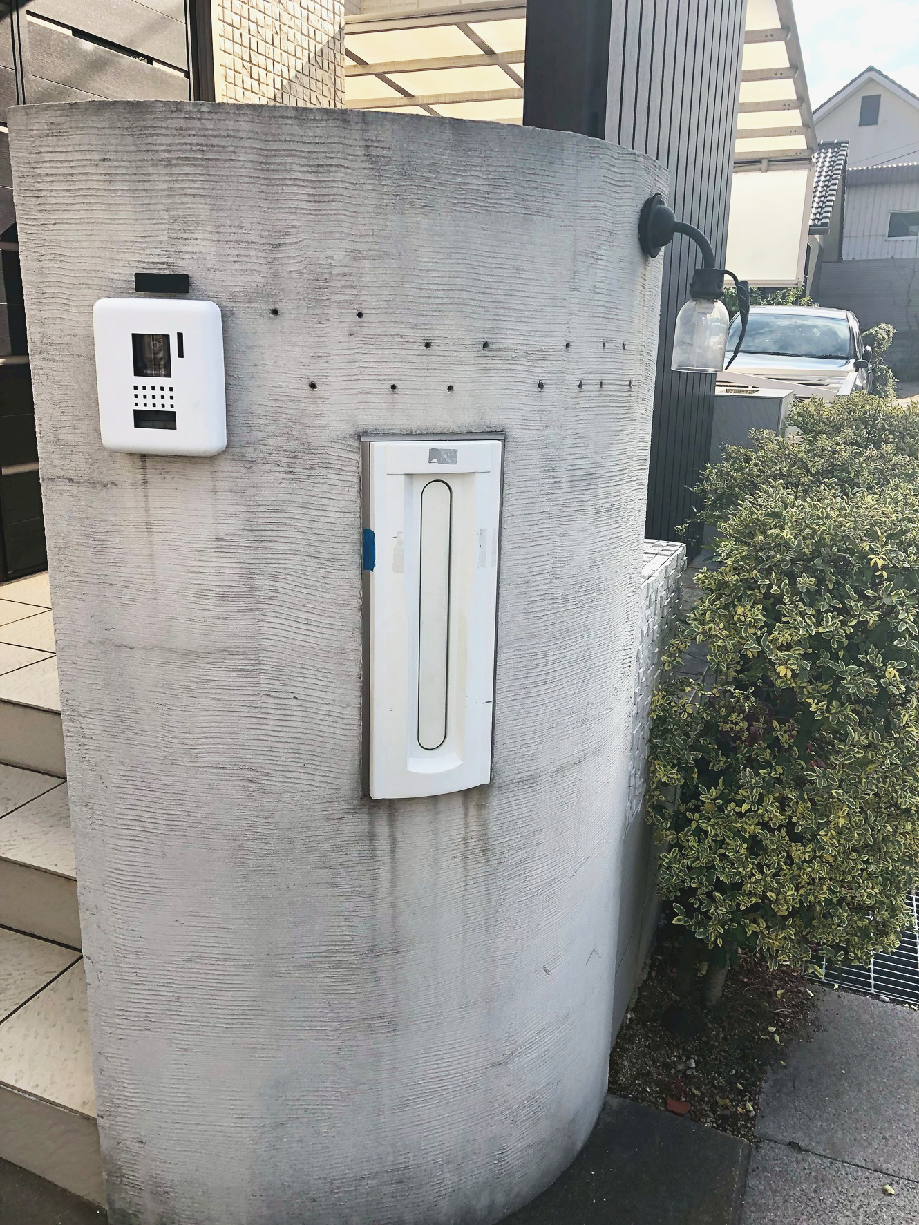 中古住宅の既存の表札を撤去し、門柱の防カビ塗装を行いました。綺麗になった門柱に番地のみのプレートを取り付けました。