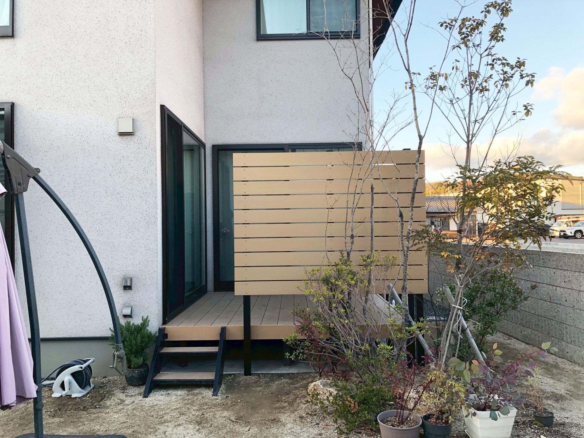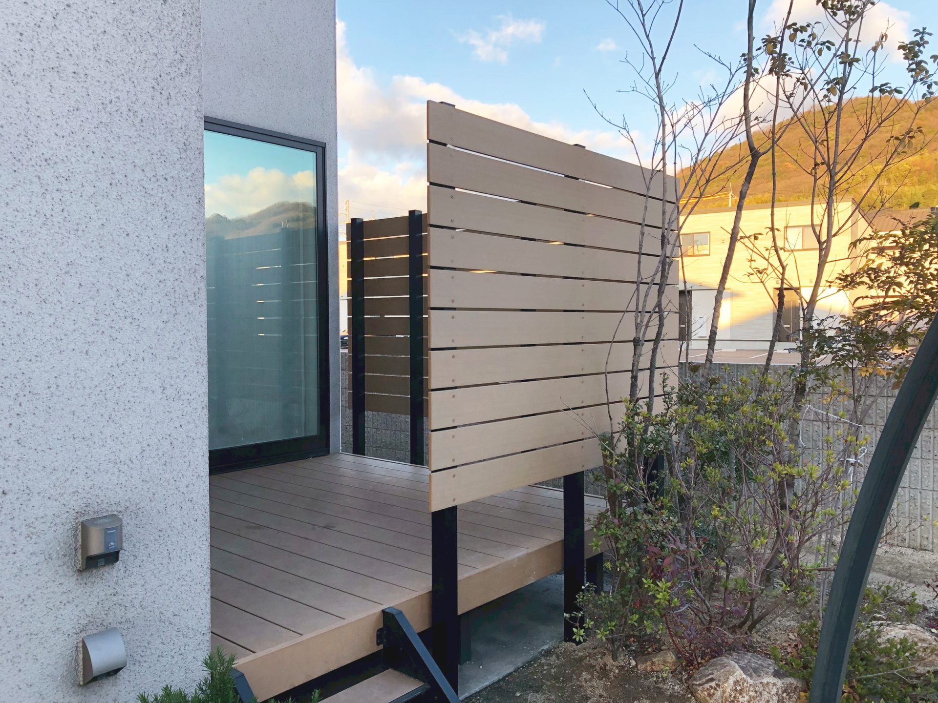 さらに2つの掃き出し窓に面にした既存のウッドデッキを囲うように樹脂製の目隠しフェンスを施工しました。デッキに近いカラーの板にサッシに合わせたブラックの柱でメリハリを演出しました。