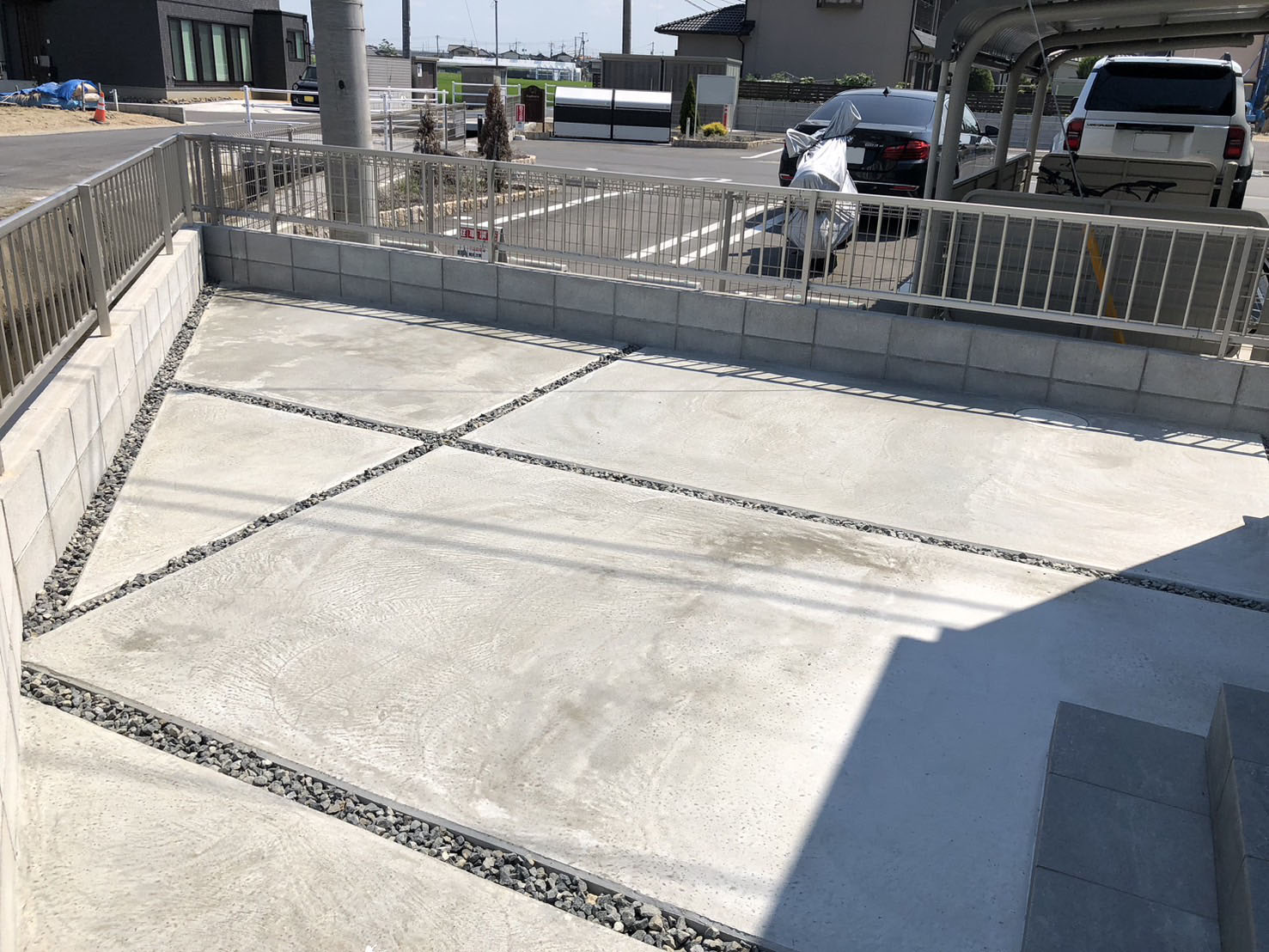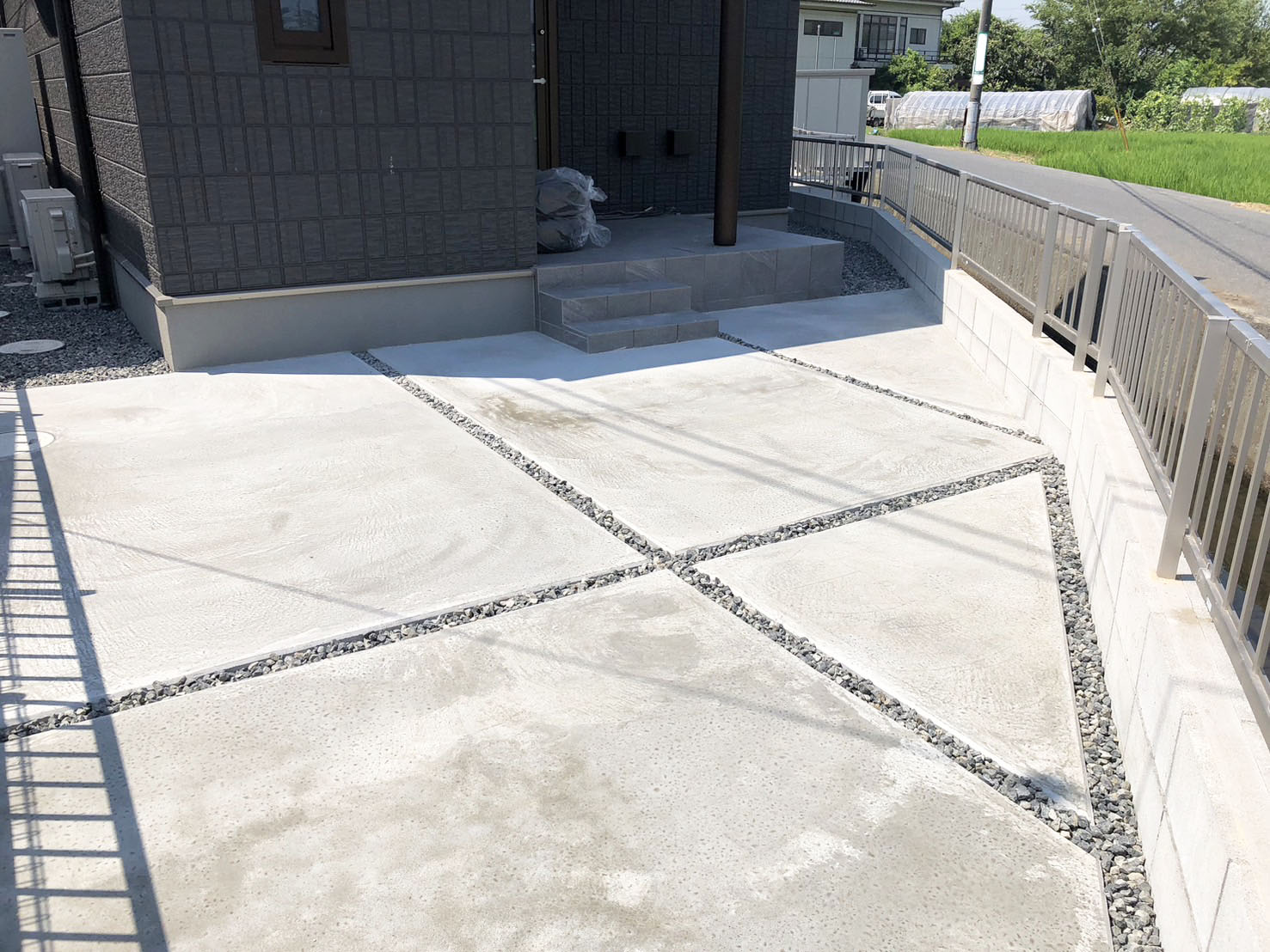 砂利ならではの質感がお家にマッチしたり、コンクリートより費用を抑えられたりとメリットもありますが、人の出入りの多い場所や作業をする場所等、コンクリートの安定したフラット感がより快適性を上げてくれる場面も多くあります。また、雑草対策としても人気が高いです。