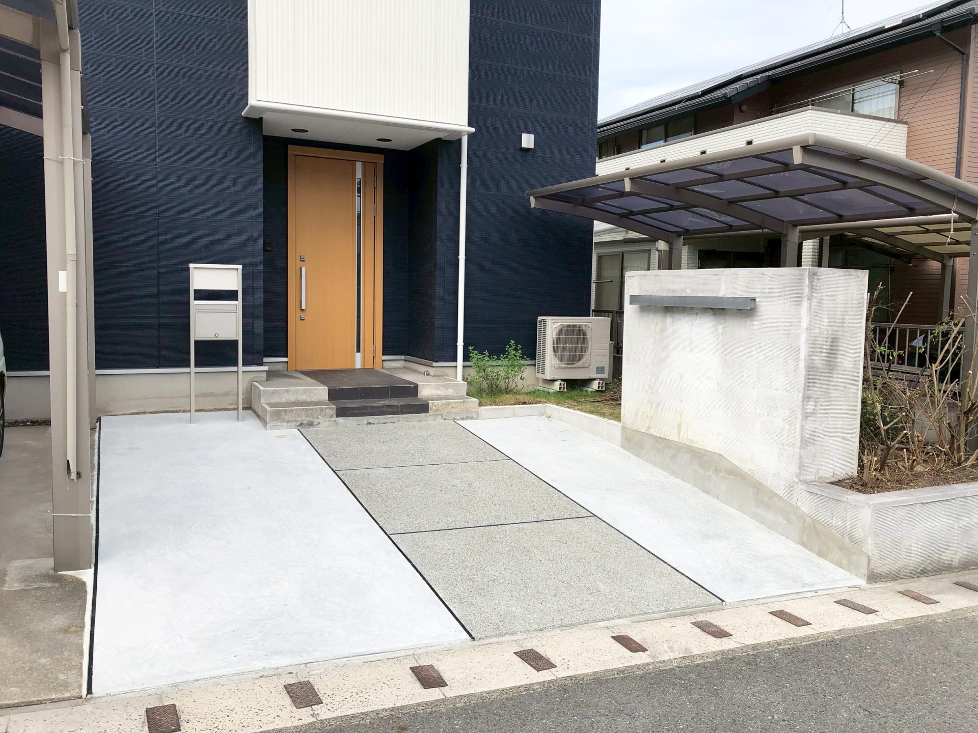 駐車スペースを拡張するために、既存の門柱・ステップ・植栽を撤去しました。玄関前の洗い出し舗装から続くように道路境界までは洗い出し舗装に、その他の部分は土間コンクリートにしました。元々ステップだった部分の勾配はなだらかな傾斜にし、既存の駐輪場にも入りやすくなりました。