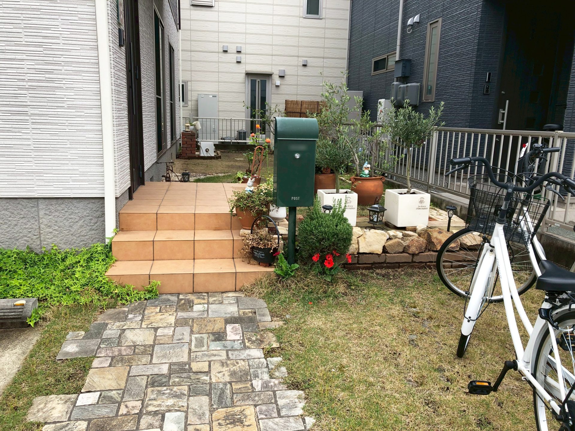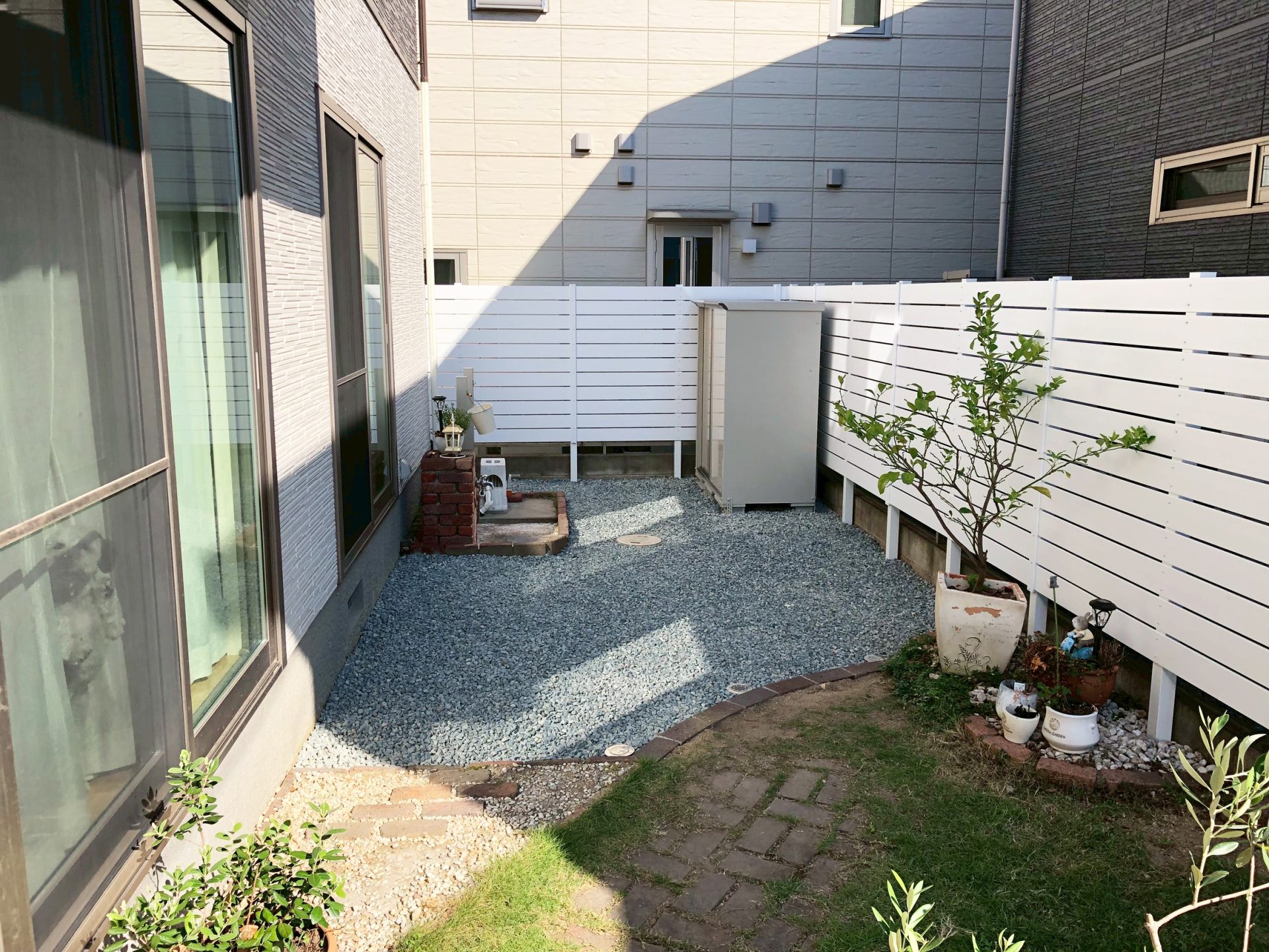道路沿いにあった物置を撤去し、目隠しフェンス前に同系色のホワイト系で新設しました。お庭部分には防草シートと砂利を敷いて雑草対策を行い、見切りには既存の花壇と合わせたレンガを使用しました。ホワイトの明るさとレンガのアンティーク感がマッチしたお庭に仕上がりました。